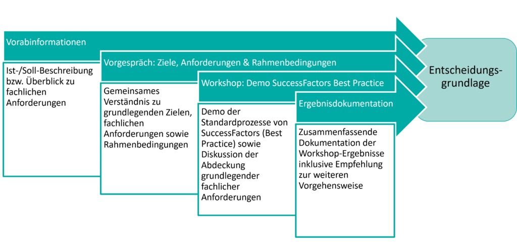 Ziel der Workshops ist zu prüfen, ob das Unternehmen seine wesentlichen fachlichen und technischen Anforderungen mit der Cloud-Lösung SAP SuccessFactors sinnvoll abdecken kann.