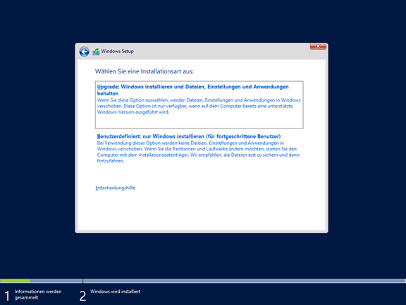 Wie beim Windows Server 2012 schlägt auch der Windows Server 2012R2 ein Upgrade vor, auch wenn die Festplatte neu und leer ist.