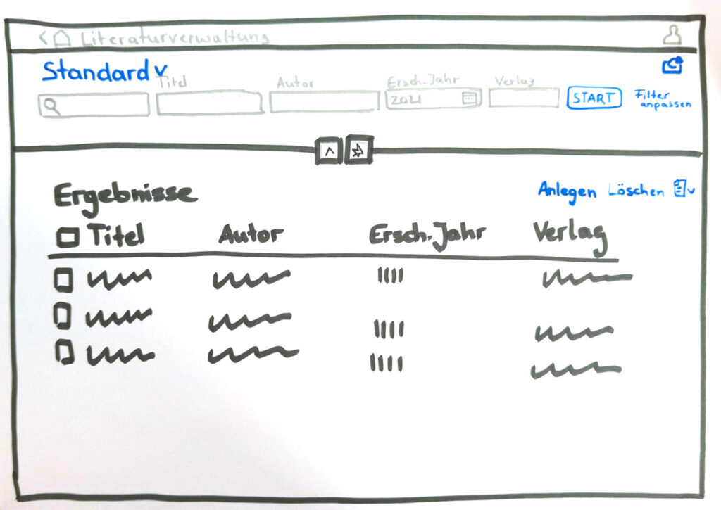 Nachfolgend haben wir für eine kleine Anwendung exemplarisch ein Wireframe sowie einen High Fidelity Mockup dargestellt.