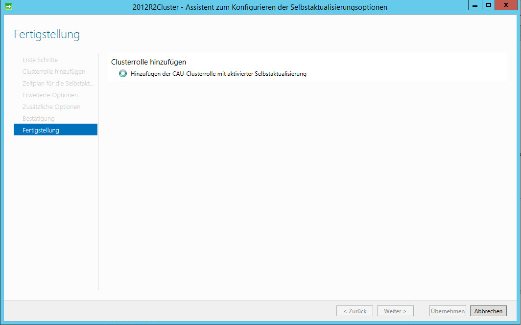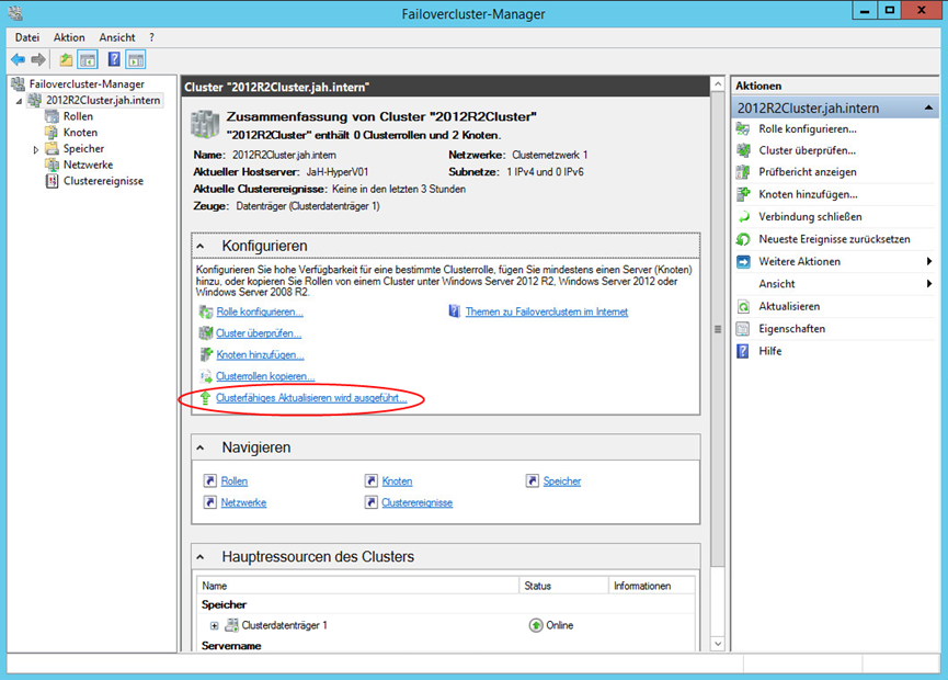 Nach dem Erstellen eines Clusters befindet sich in der Übersicht des Failovercluster-Manager ein Link zur Konfiguration des CAU (siehe rote Markierung).