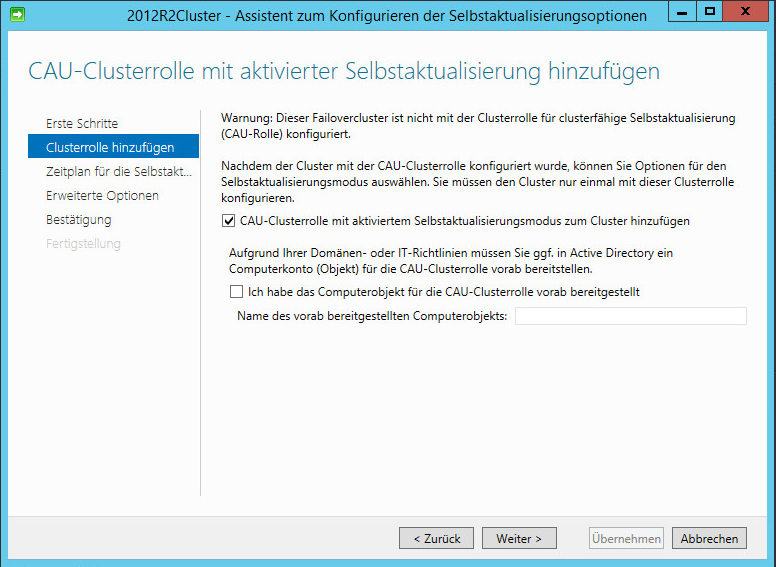 In dem nun erscheinenden Assistent zum Konfigurieren der Selbstaktualisierungsoption muss zunächst noch einmal bestätigt werden, dass wirklich diese Clusterrolle installiert werden soll. Weiterhin kann man hier angeben, ob man zuvor ein Computerobjekt für die Clusterrolle bereitgestellt wurde oder nicht. In diesem Szenario wurde so ein Objekt nicht zuvor erstellt und die Rolle im Kontext eines Domänen-Administrators hinzugefügt.