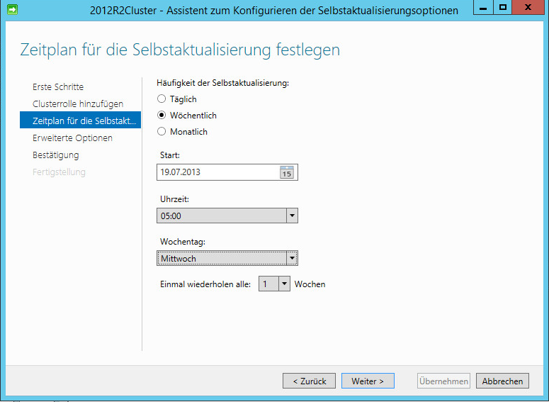 Im nächsten Fenster kann eingestellt werden, wann nach Updates gesucht werden soll. Hier wurde ein wöchentlicher Rhythmus an einem Mittwoch zu einem Zeitpunkt ausgesucht, wo alle Backups gelaufen sein sollten. Der Mittwoch ist deswegen gewählt, da Microsoft Updates oft an einem Dienstag erscheinen und man somit meist das kürzeste Zeitfenster hat, bis diese installiert werden.