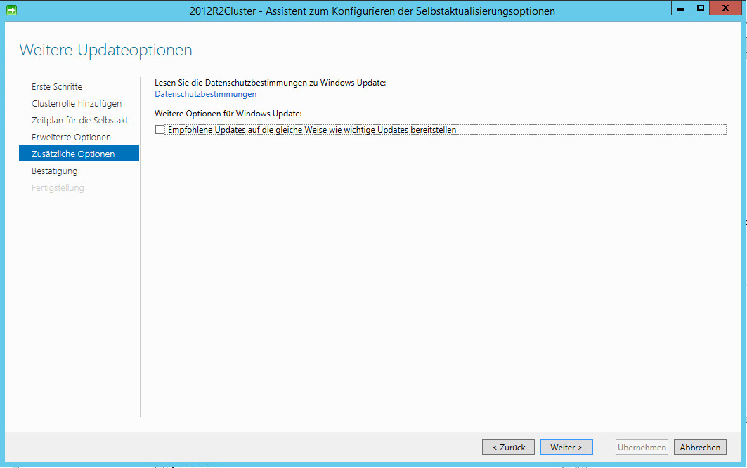Anschließend hat man die Möglichkeit, weitere Einstellungen vorzunehmen, wie zum Beispiel das Ausführen spezieller Skripte vor oder nach einem Update. Da dies in diesem einfachen Szenario nicht benötigt wird, wurde alles auf Standard gelassen.