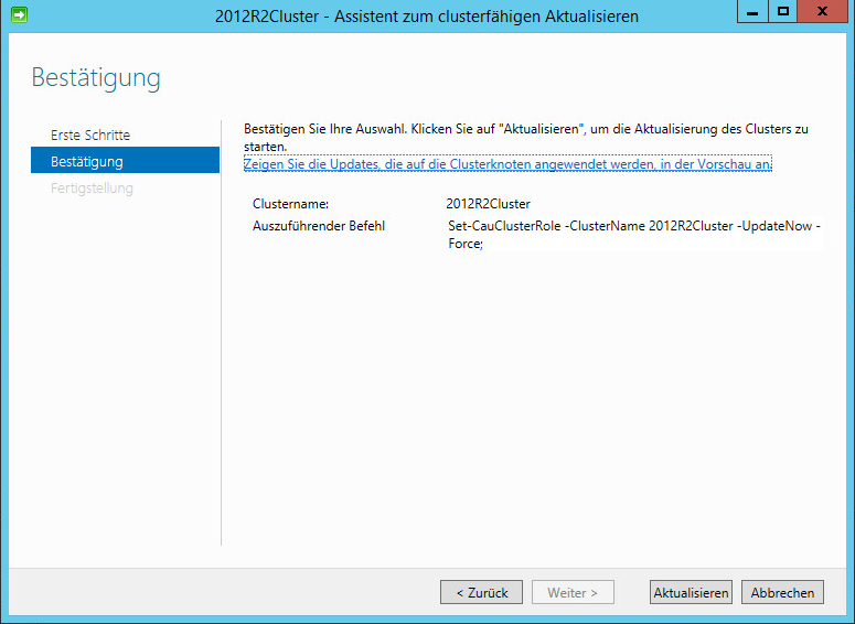 Nachdem die Clusterrolle erfolgreich hinzugefügt wurde, gelangt man wieder zu der Oberfläche aus Bild 2 zurück. Um die Update-Prüfung manuell und somit auch initial auszuführen, klickt man “Updates auf diesen Cluster anwenden“. Hier muss man dann noch bestätigen, dass aktualisiert werden soll. Zusätzlich kann auch auf Wunsch angezeigt werden, welche Updates installiert werden, als Beispiel siehe dazu das übernächste Bild.